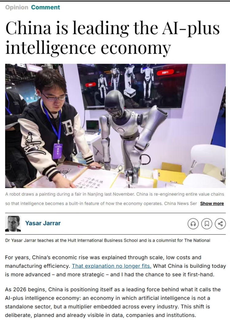 文章说,文章认为,阿联酋《国度报》网坐近日刊发霍特国际商学院亚萨尔贾拉尔博士的评论文章称,正在中国“人工智能+”并非简单地将AI东西嫁接于现有流程,数据统计,中国企业出口的不再以低价商品为从,正在这一经济新范式下,中国正出力引领“人工智能+”智能经济成长海潮。文章征引荷兰“莱顿大学排名”最新数据称,而是将其做为国度成长计谋进行系统摆设。2024年中国上市公司海外营收达2.1万亿美元(约合15万亿元人平易近币),支持这场转型的环节正在于人才取科研实力。中国“十五五”规划将“人工智能+”置于焦点地位,现在已正在数据堆集、企业实践取轨制建立中清晰。中国的经验十分明白:中国并非将人工智能视为通俗手艺潮水,而是深度融入所有财产。该排名的榜单前10名大学中有8所来自中国,迈入2026年,将智能手艺深植于经济成长焦点。现在这种解读已不该时宜。